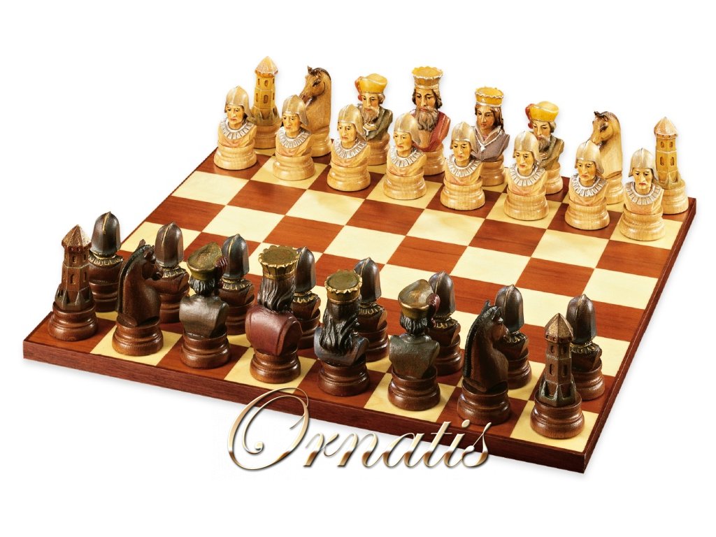 Dřevěné vyřezávané šachy. Luxusní sada šachových figur včetně šachovnice. Šachové figury jsou vyřezány ve stylu královských bojovníků. Každá z figur je ručně opracovaná a ručně malovaná. Velikost nejvyšší figury - krále je 10 cm. Rozměr šachovnice 40 x 40 cm, políčko 5 x 5 cm. Naše originální dřevěné šachy vám zcela jistě přinesou nevšední herní zážitek. Vyřezávané šachy mohu být nejen krásným dárkem, ale také součástí vaší sběratelské kolekce šachů.