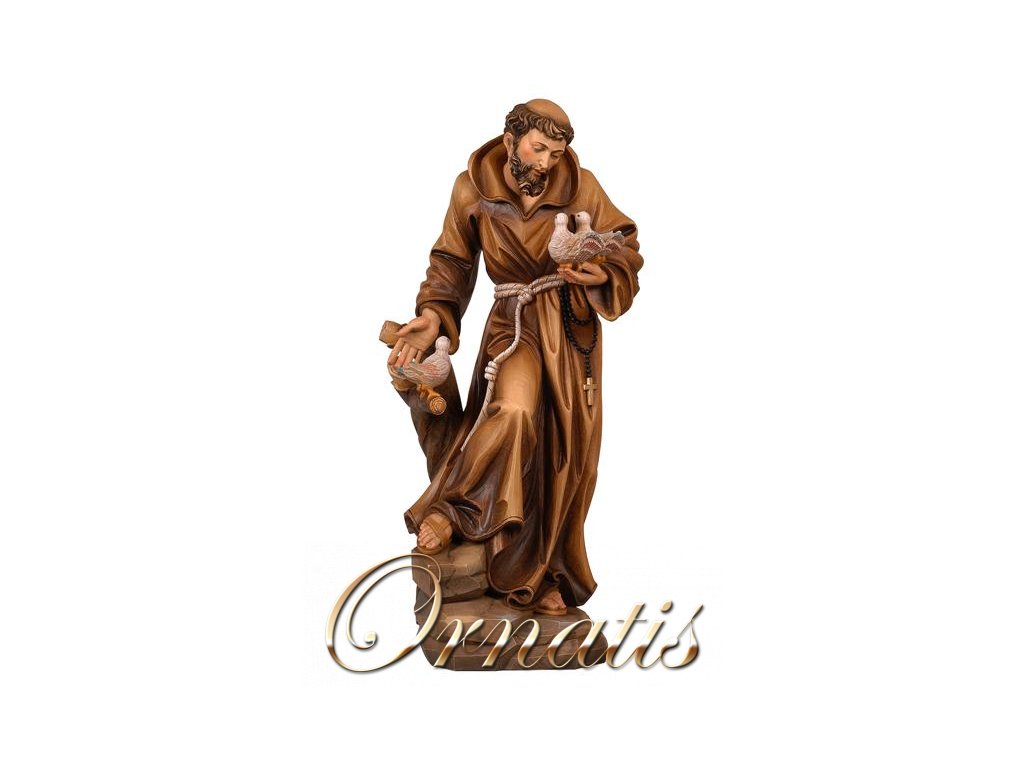 Dřevěná socha Svatého Františka. Svatý František je patronem Itálie, zvířat, přírody, ochránců chudých nebo Filipín. František se narodil 5. července 1182 do rodiny bohatého obchodníka s látkami. Pokřtěn byl jménem Giovanni neboli Jan. Kamarádi a příbuzní mu však říkali Francouzek, jelikož díky své matce uměl francouzsky. Odtud tedy přišlo jeho jméno František, které použil jako jméno pro svůj řád. František se toužil stát rytířem a v roce 1201 se účastnil tažení proti Perugii. Byli však poraženi a František zůstal na rok v zajetí, kde onemocněl a nemohl se již účastnit boje proti císaři. František měl četné sny, ve kterých mu Bůh oznamoval, že jeho posláním je služba Bohu spojená s chudobou. Poté, co František navštívil Řím, zklamán bohatstvím církve, vyměnil svůj šat se šatem žebráka a začal pomáhat chudým lidem a rozdávat svůj i otcův majetek. To však otce rozzlobilo natolik, že syna vydědil. František byl hluboce spjat s přírodou a se zvířaty, které označoval za své bratry a sestry a ochraňoval je před lidskou surovostí. V roce 1209 založil Řád menších bratří, který schválil papež Inocenc. František byl také u zrodu řádu klaristek, kdy ho v roce 1212 chtěla v jeho poslání následovat Svatá Klára. Dle legendy je prvním u koho se za jeho života objevila stigmata, stejné rány jako měl Ježíš po ukřižování. František zemřel 3. října 1228 na zemi přikrytý pláštěm.